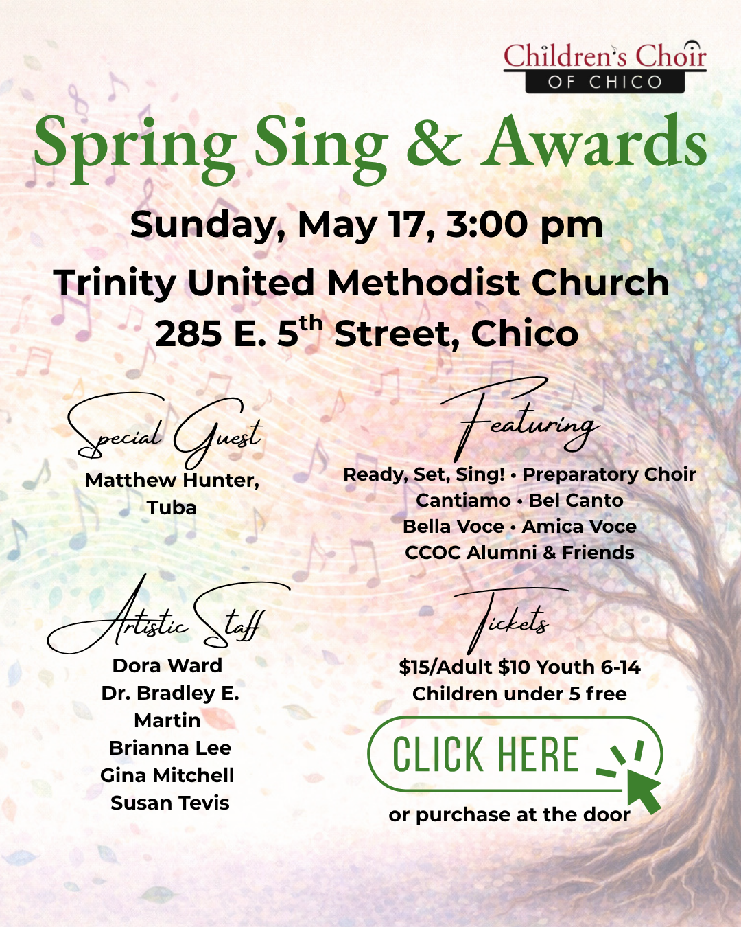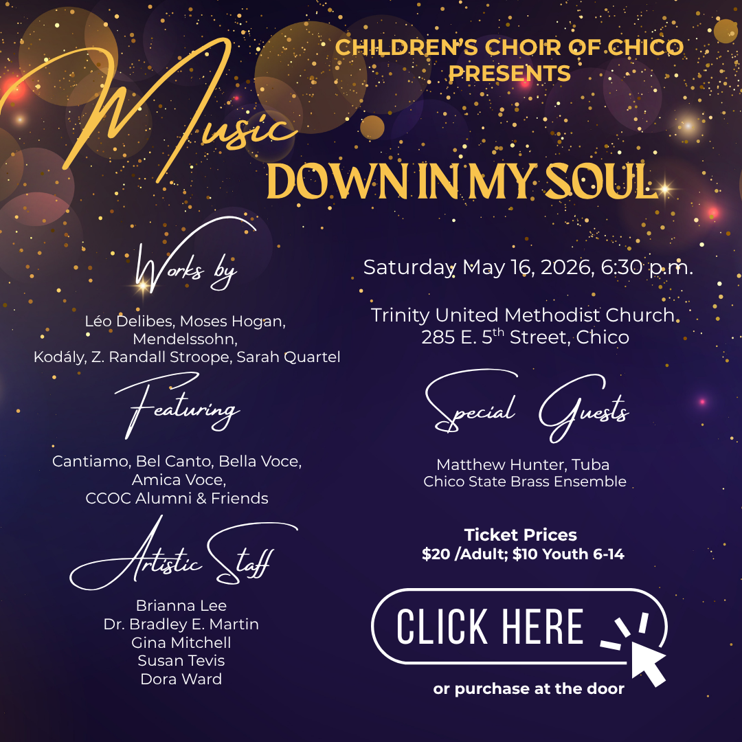 Children’s Choir of Chico was formed in 2001 by artistic Director Susan Tevis to unite the purity of children’s voices with excellence of choral music education and artistic performance. Guided by Tevis, an active clinician and guest conductor of treble choirs throughout the United States, the original choir has expanded to five choirs, including music experiences for early childhood and adult women. Experience and training are not necessary for any of the choirs, except Bel Canto. For information on individual choirs and rehearsal times, or to schedule an interview for Bel Canto, please contact us at 530-342-2775 or ccoc@childrenschoirofchico.org.